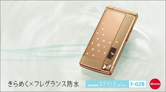 F-02Bは、先進の防水性能(IPX5/IPX7/IPX8(注1))・防塵性能(IP5X(注2))に加え、各色にディティールの異なるきらめきのデザインやイルミネーションを採用。またケータイ背面のフレグランスピースにお気に入りのフレグランスを付け、香りをケータイできるようになっています。
