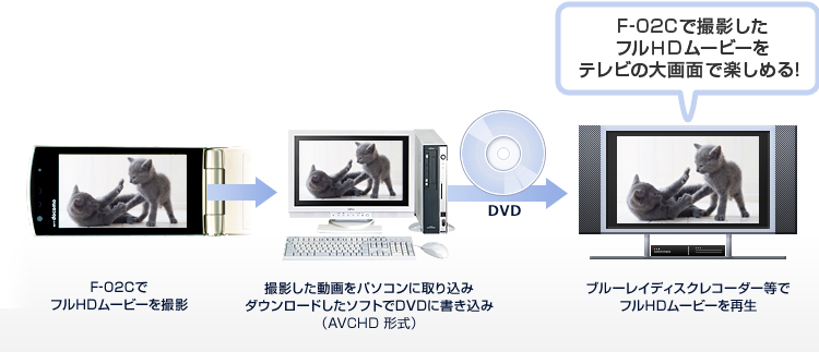 F-02Cで撮影したフルHDムービーのDVD(AVCHD形式)を作成できる、パソコン向けソフトを無料でご利用いただけます。書き込んだフルHDムービーは、ブルーレイディスクレコーダー等で再生できるので、ご家庭のテレビでフルHDムービーを楽しむことができます。