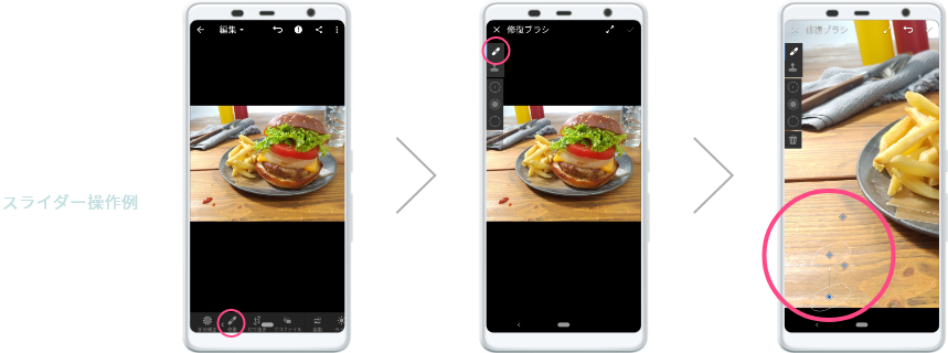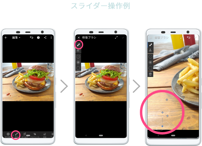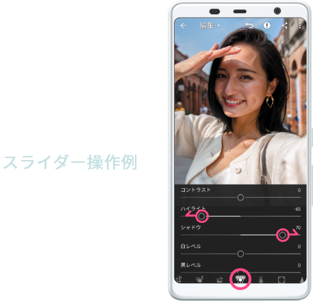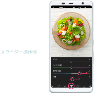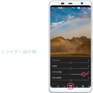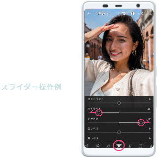 アプリ上のスライダーを動かすだけの簡単操作で、かすんだ景色をくっきり印象的に、見せたい色をもっと鮮やかに、さらには逆光で陰になった顔を明るく補正するなど、あっという間に自分好みの作品に格上げできます。