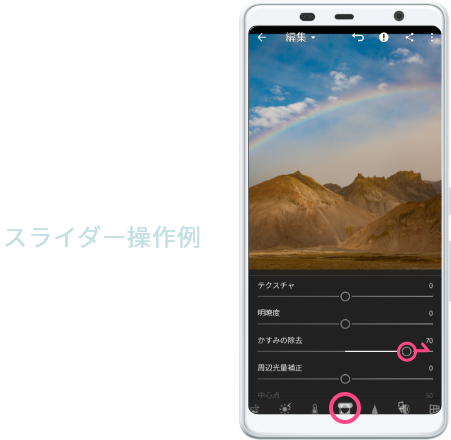 「かすみの除去」スライダーを操作することでくっきりとメリハリのある仕上がりに編集する事ができます。