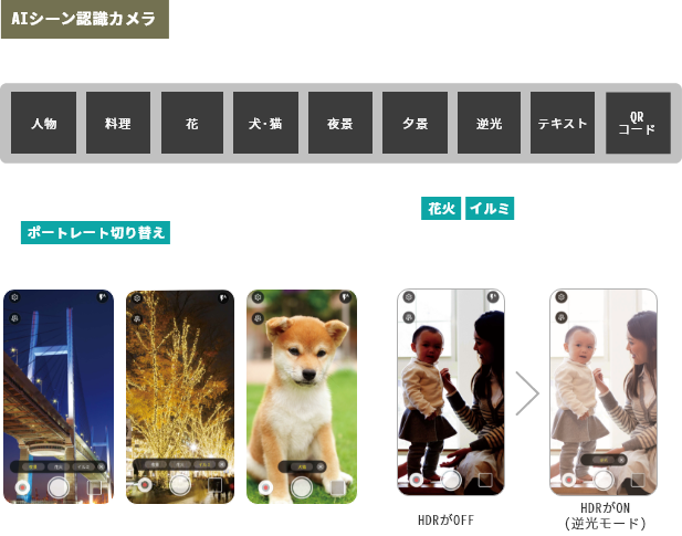 動物(犬猫)や夜景など9シーンにおいて、被写体を自動認識し、露出・彩度などを最適化。さらに、被写体のコントラスト比(明暗差)が大きい時にはオートHDRが起動し、最適な明るさに調整。逆光の時にも顔が暗くならずキレイに撮影することができます。