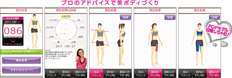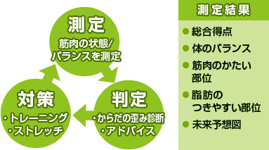 【測定】 筋肉の状態/バランスを測定 ⇒ 【判定】 からだの歪み診断/アドバイス ⇒ 【対策】 トレーニング/ストレッチ 【測定結果】 総合得点、体のバランス、筋肉のかたい部位、脂肪のつきやすい部位、未来予想図