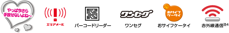 | spモード(注5) | おサイフケータイ | 防水 | ワンセグ | 赤外線通信 |