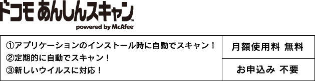 アプリケーションのインストール時などにスキャンを実行してウイルスが検出された際に、注意喚起メッセージを表示することで、スマートフォンをウイルスの脅威からまもります。また、「インストールされたアプリケーション、SMS、microSDカード、パソコン等とのUSB接続」を通して侵入するウイルスをスキャンします。