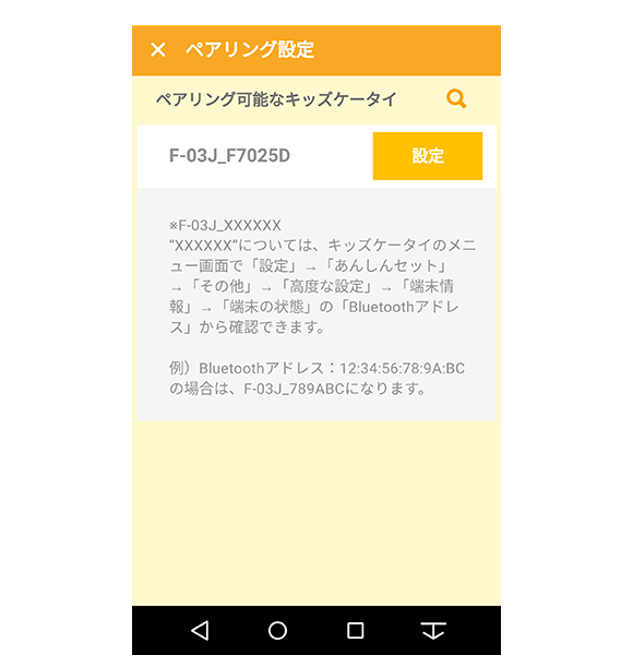 - ペアリングしたいキッズケータイ F-03Jを選び、「設定」をタップします。