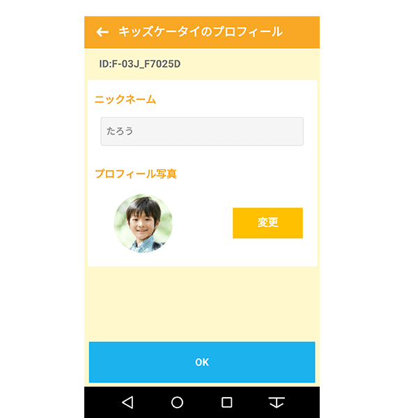 プロフィール写真は、ニックネーム同様、スマートフォンのアプリ上で、キッズケータイを使っている方のプロフィールとして表示されます。お子さまの写真など、分かりやすいものを登録してください。