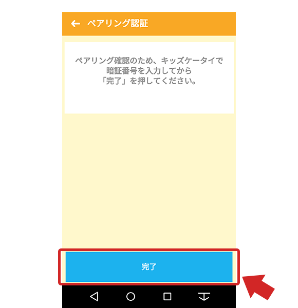 - スマートフォンとキッズケータイ F-03Jをペアリングするためにキッズケータイ F-03Jで暗証番号を入力後、「完了」をタップします。