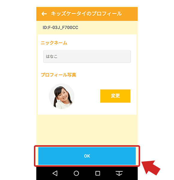 - ニックネームとプロフィール写真を登録し、「OK」をタップするとキッズケータイを追加することができます。