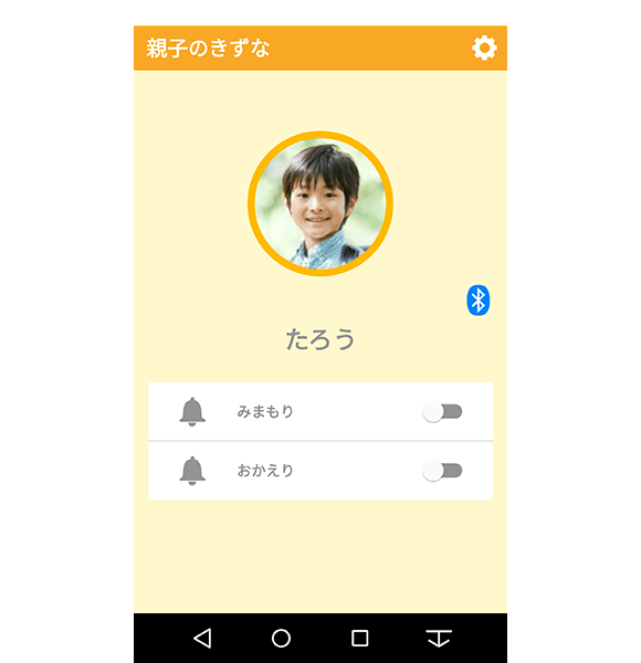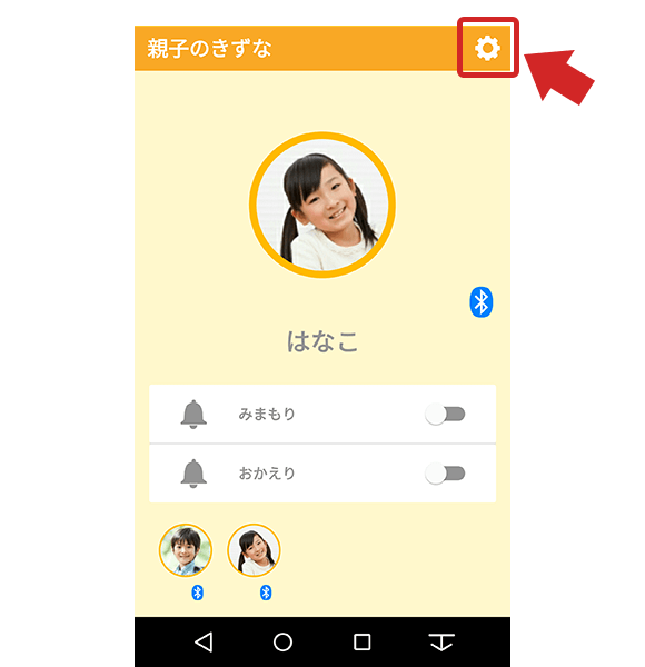 - 「親子のきずな」アプリのホーム画面右上にある設定ボタンをタップします。