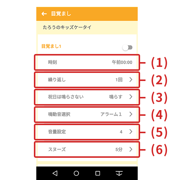 - 目覚まし起動時の鳴動音の音量を設定します。
