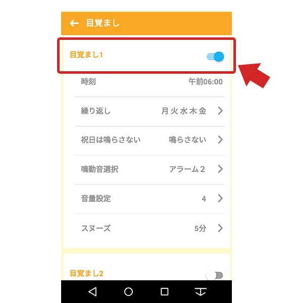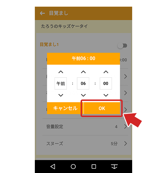 目覚ましを起動する時間を設定し、「OK」をタップします。