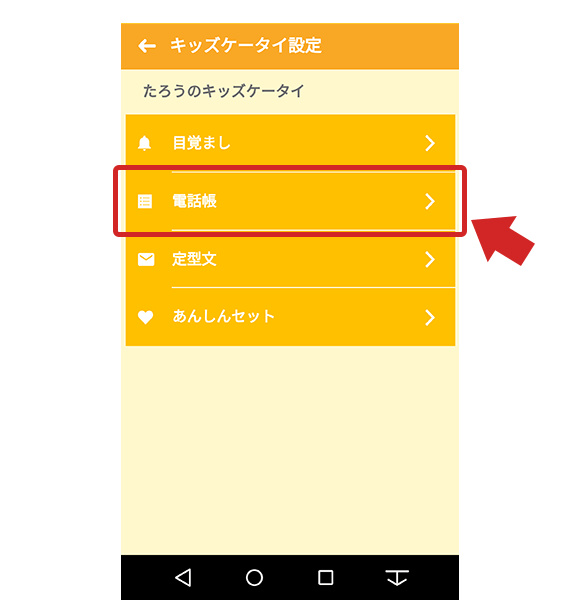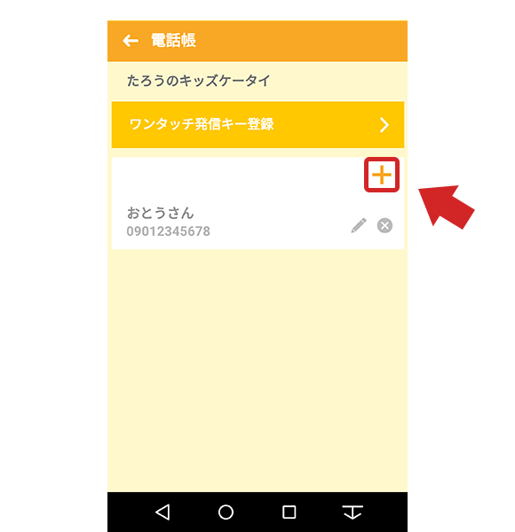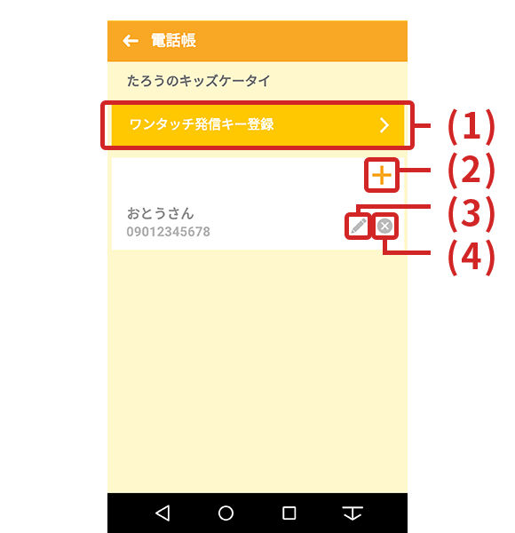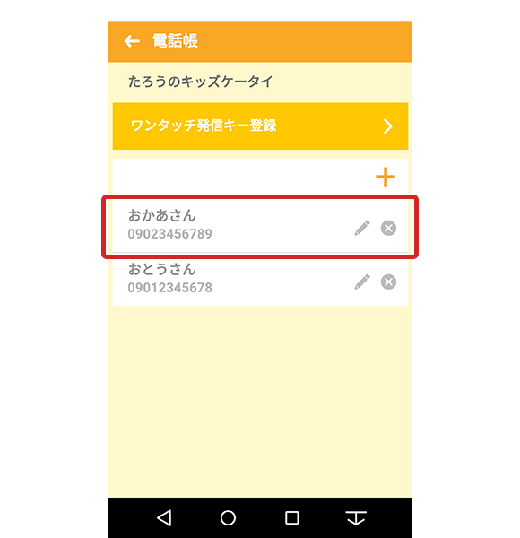 - 現在、キッズケータイに登録されている電話帳が表示されます。
