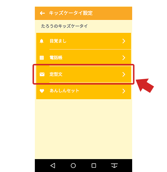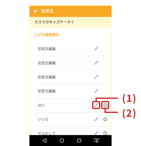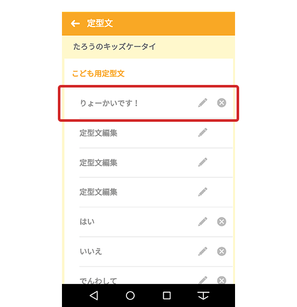 - 現在、キッズケータイに登録されている定型文が表示されます。