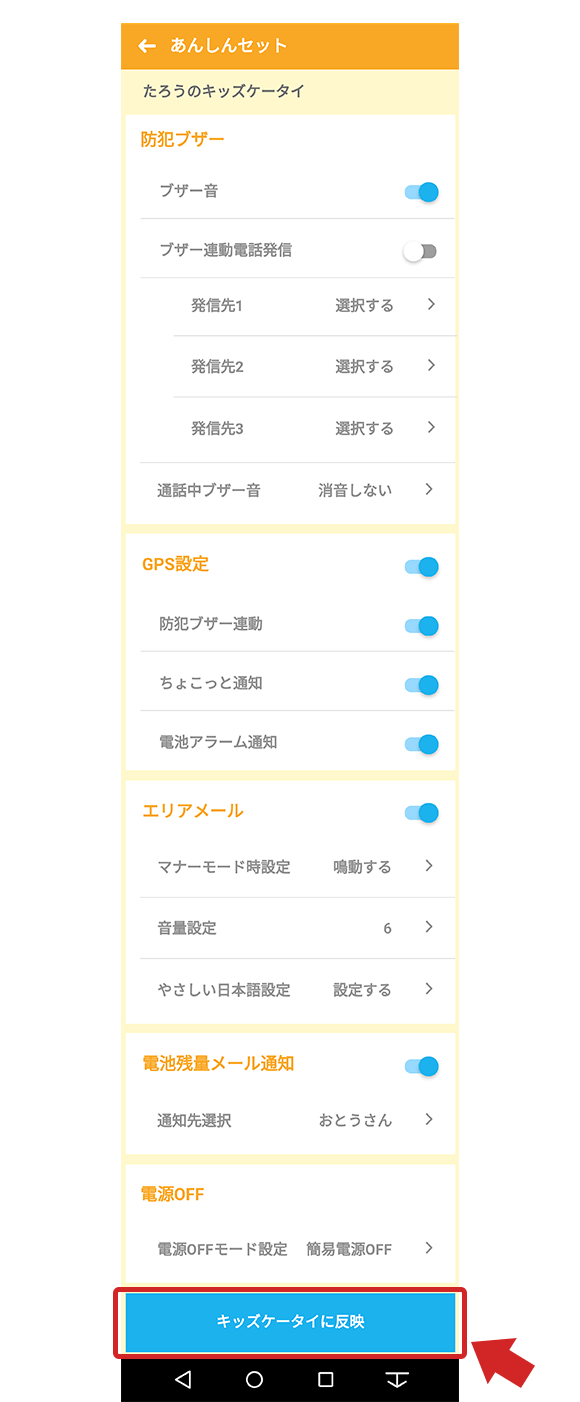 - 「キッズケータイに反映」をタップし、設定内容をキッズケータイに転送します。