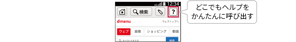 各機能の画面上に表示されたはてなマークのヘルプボタンを押すだけで、らくらくスマートフォン me のさまざまな使い方をかんたんに調べることができます。いつでもどこでもわからないことをその場で調べられるので便利です。