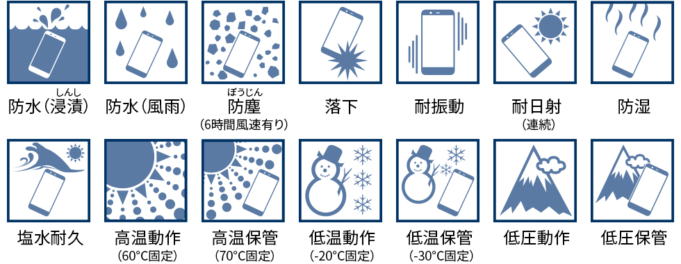 米国国防総省の調達基準(MIL-STD-810G)の14項目、防水(浸漬)、防水(風雨)、防塵(6時間風速有り)、落下、耐振動、耐日射(連続)、防湿、塩水耐久、高温動作(60℃固定)、高温保管(70℃固定)、低温動作(-20℃固定)、低温保管(-30℃固定)、低圧動作、低圧保管に準拠した試験を実施。状況や環境によっては、動作を保証できない場合があります。