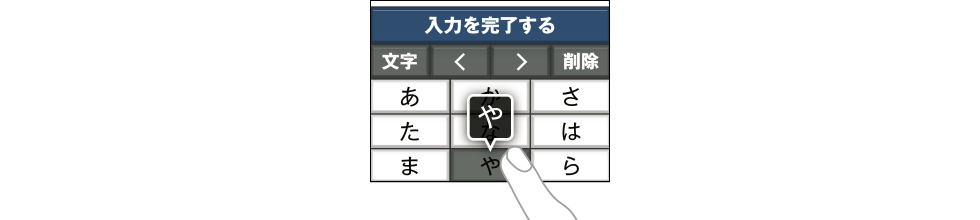 押した行の文字がすべてポップアップ表示されるので「お」や「こ」などの母音に“お”がつく文字も、ボタンを2回押すだけで文字入力が可能です。