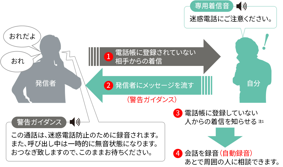 電話帳に未登録の番号から電話がかかってきたとき、発信者側に迷惑電話対策を設定している旨を自動で伝えます。万一、迷惑電話だった場合でも、相手を牽制できるうえ、会話も録音されるのであんしんです。