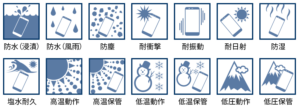 米国国防総省の調達基準(MIL-STD-810G)の14項目、落下、浸漬、粉塵、塩水噴霧、湿度、太陽光照射、振動、風雨、高温動作(60°C固定)、高温保管(70°C固定)、低温動作(-20°C固定)、低温保管(-30°C固定)、低圧保管、低圧動作に準拠した試験を実施。状況や環境によっては、動作を保証できない場合があります。