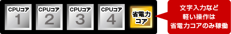 基本の4つのCPUコアにプラスして“省電力コア”を搭載しました。軽い処理のときは省電力コアのみ稼働し、負荷がかかる処理のときは4つのCPUを稼働するというように、稼働量に応じてコアを選択。スピードを保ちながら、省電力も両立しました。