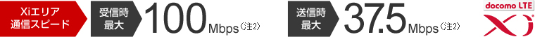 【Xiエリア通信スピード】 受信時最大:100Mbps(注2)/送信時最大:37.5Mbps(注2)