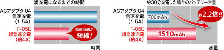 従来の急速充電と比べて、さらに短い時間で行える超急速充電にも対応。約30分間で従来の約2.2倍の容量を充電できます。