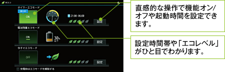 省電力を実現する機能が満載。「タイマーエコモード」など、きめ細かく設定できて便利です。