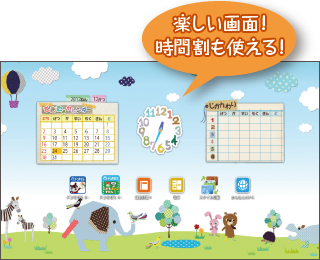 「できたよカレンダー」や「じかんわり」など、便利なアイテムを分かりやすく画面に配置。かわいいデザインで楽しく使えます。
