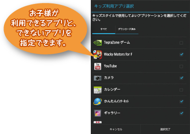 キッズスタイルで使えるアプリ、使えないアプリを指定可能。お子様が利用できるアプリを事前に設定できるので安心です。