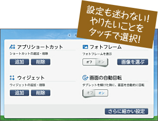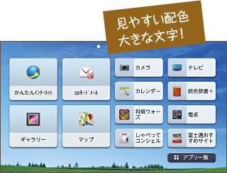 大きい文字やクリアな配色で画面を構成。使いたい機能が分かりやすく表示されるため、タブレットをカンタンに使いこなせます。