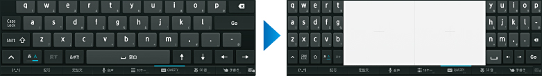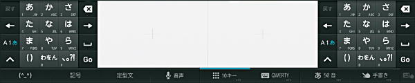 PC標準のキーボード配列。大きなキートップ表示で快適に入力できます。また、左右に分割すれば指の動きを少なくでき、同時に手書き入力も行えます。