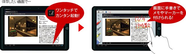 ステータスバー横のアイコンへのタップ操作か、スワイプ操作(注12)をするだけで、表示している画面を保存できます。さらにそのまま手書き入力をしたり、地図上に道順を書いたり、注目してほしい箇所にマーカーを引いたりと、多彩な使い方が楽しめます。書いたメモはSNSなどへワンタッチで共有できるので便利です。