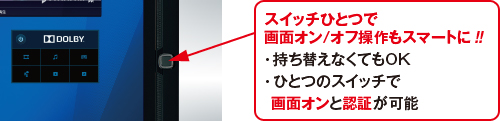 画面オンから画面ロック解除、一連の認証解除まで、たったの指1本で。パターン入力やパスワード入力の必要なく、スイッチを押してから指でセンサーをなぞるカンタンな動きだけで、一連の操作をスマート&快適に実現します。