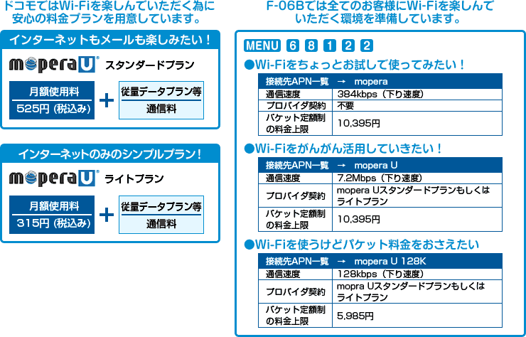 F-06BのWi-Fiのアクセスポイント機能を利用するには、接続先の設定と、ドコモのプロバイダサービスmopera Uの契約が必要な場合があります。ここでは接続に必要なプランなどを紹介しています。