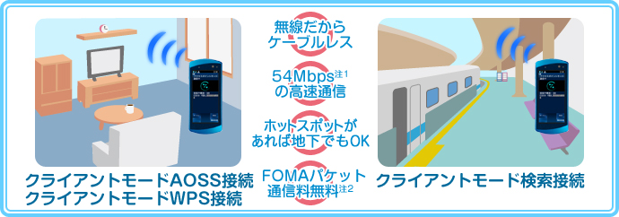 無線LANアクセスポイントに接続することで、最大54Mbps(注1)のより高速なフルブラウザ閲覧が可能です。また、AOSS接続とWi-Fi PROTECTED SETUP(WPS)に対応しているため、アクセスポイントとの接続もカンタンに設定できます。