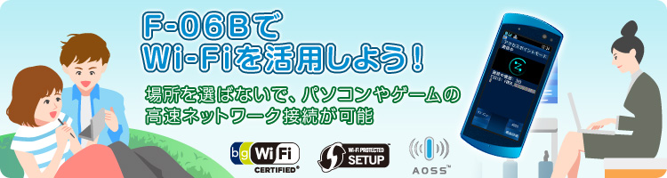 F-06Bを無線LANのアクセスポイント(親機)とすることで、Wi-Fi対応のPCや携帯型ゲーム機からFOMAエリア内でいつでもインターネット接続が利用できます。また、AOSS接続に対応しているため、F-06BとWi-Fi対応機器を簡単に接続することができます。
