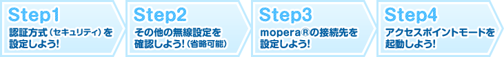 アクセスポイントモードを安心してご利用いただくために、Step1からStep4の手順に従って設定を行ってください。