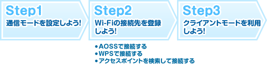 クライアントモードをご利用頂くために下記のStep1からStep3手順に従って設定を行ってください。