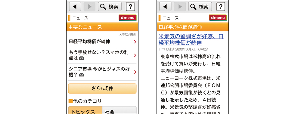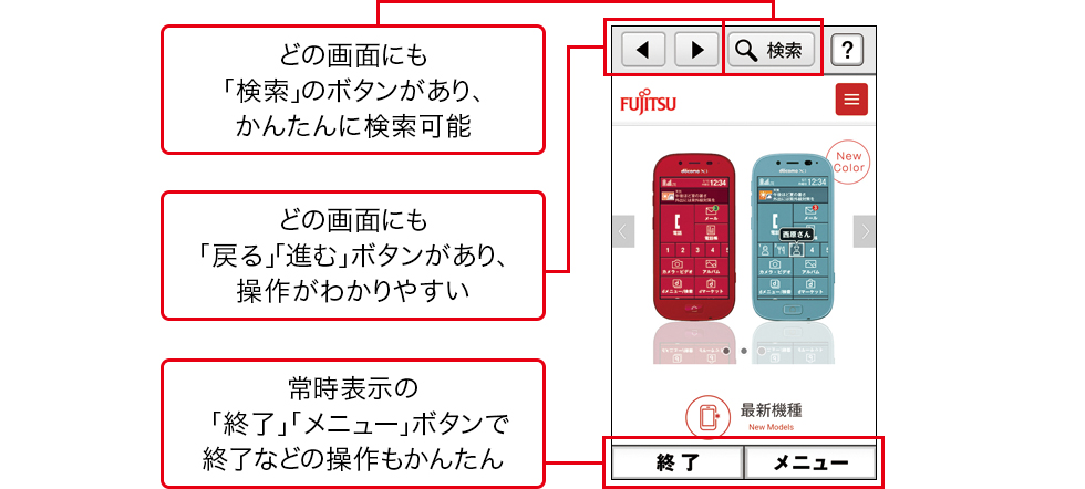 インターネットをかんたんに楽しめるよう、専用ブラウザを搭載。操作ボタン・検索ボタンの常時表示や、シンプルなレイアウト構成など、使いやすさにこだわりました。