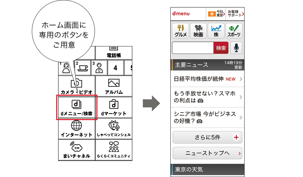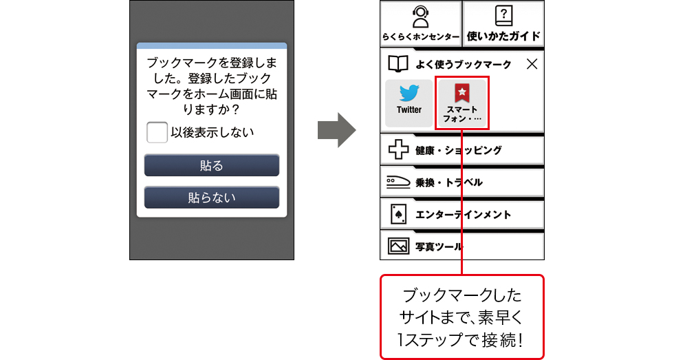 ホーム画面上にブックマークしたサイトのショートカットボタンを配置できます。わざわざブラウザを開いてからメニューを探すことなく、よく閲覧するサイトに素早くかんたんにアクセスできます。