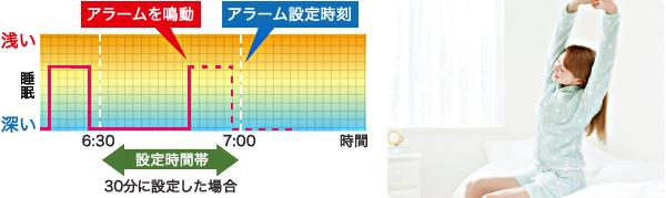 加速度センサーとマイクを使い、睡眠中の体の動きや呼吸から眠りの深さを検知。眠りが深いときではなく、浅いときにアラームを鳴動させ、スッキリ快適な目覚めを促します。