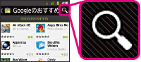 2、マーケット画面右上の虫眼鏡マークをタッチ。入力エリアに「@Fケータイ」と入力し「@Fケータイ応援団」アプリを選択。