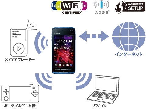 スマートフォンがWi-Fiアクセスポイントルーターになる「テザリング」機能(注4)に対応。いつでもブロードバンド環境が作れるので、外出先でもパソコンやポータブルゲーム機などのインターネット対応機器を快適に利用することができます。