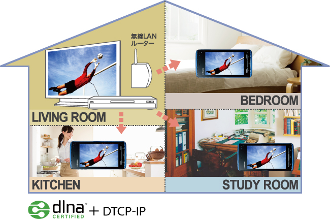 DLNAに対応しているブルーレイディスクレコーダー(注2)などと連携して、録画した地デジ番組を高画質でストリーミング再生(注3)することができます。家中どこでも視聴できるので、部屋ごとにテレビやレコーダーを置く必要がなくなります。