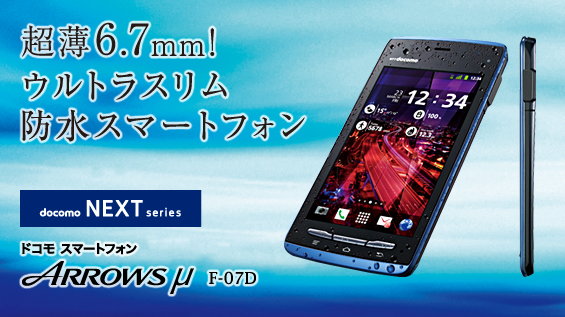 「ARROWS μ F-07D」は、超薄6.7mmと軽さ105gを実現した“ウルトラスリム防水スマートフォン”です。防水性能はもとより、薄さ軽さに加え堅牢さも兼ね備えたことで、幅広いシーンで安心して使用できます。また、圧倒的に色鮮やかな「NEW AMOLED(有機EL)ディスプレイ」や「1.4GHz 高性能CPU」、「サクサクタッチパネル®」搭載など、ウルトラスリムボディに高機能を凝縮しました。