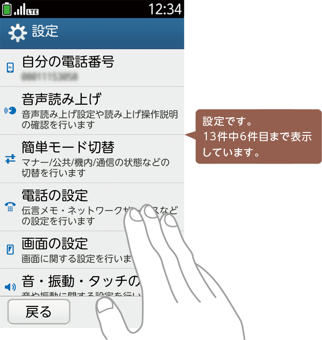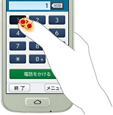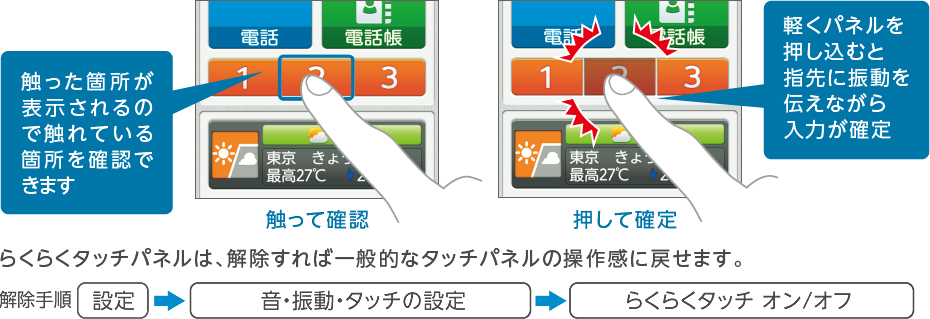【触って確認】 触った箇所が表示されるので触れている箇所を確認できます/【押して確定】 軽くパネルを押し込むと指先に振動を伝えながら入力が確定/らくらくタッチパネルは、解除すれば一般的なタッチパネルの操作感に戻せます。【解除手順】 設定 ⇒ 音・振動・タッチの設定 ⇒ らくらくタッチ オン/オフ
