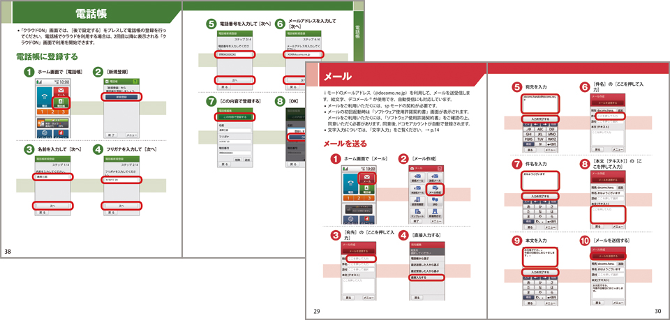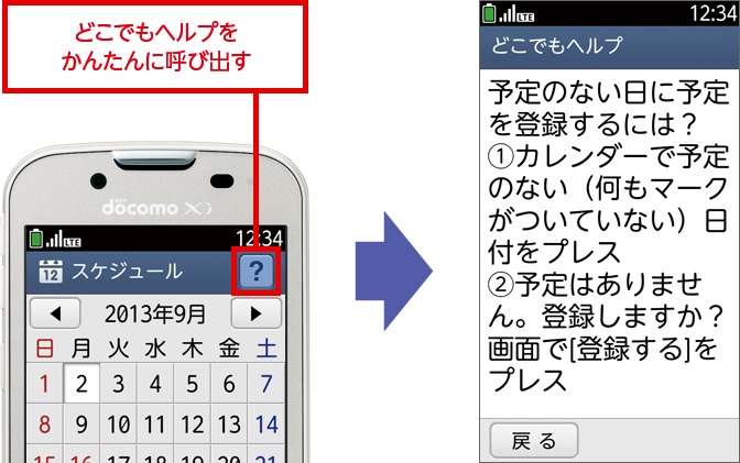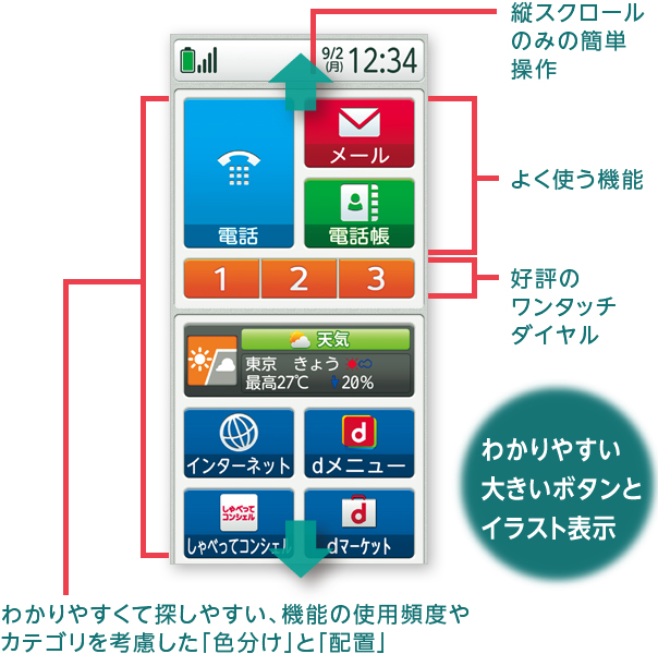 らくらくスマートフォン2の操作方法や画面の見方などがすぐにわかる「かんたん操作ガイド」を同梱しました。大きな文字表記はもちろん、「電話帳」「メール」などの項目ごとの色分けや、わかりやすいイラスト説明など「見やすさ」「わかりやすさ」にこだわりました。