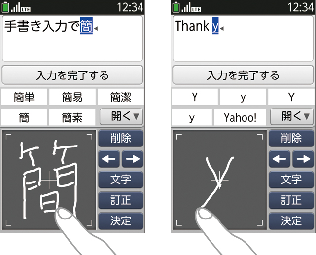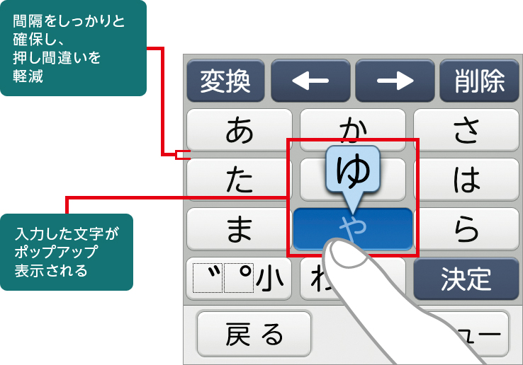 見やすさにこだわり、大きな文字のボタンを採用。ボタン間隔をしっかりと確保しているので、誤って隣のボタンに触れてしまう間違いを最小限に抑えます。また、文字変換に定評のあるATOK®が、快適な文字入力をサポートします。