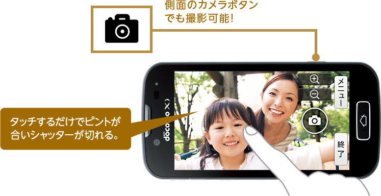 画面に直接指でタッチするだけでピントが合い、さらにシャッターまで切れるタッチシャッター機能を搭載しました。押しやすいカメラボタンでも撮影できます。