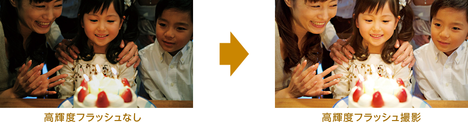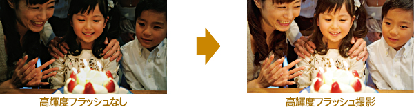 暗いシーンでも明るく撮影できます。被写体との距離に応じて、最も適した明るさでフラッシュが光るため、白飛びや光量不足が解消され、キレイな写真が撮影できます。